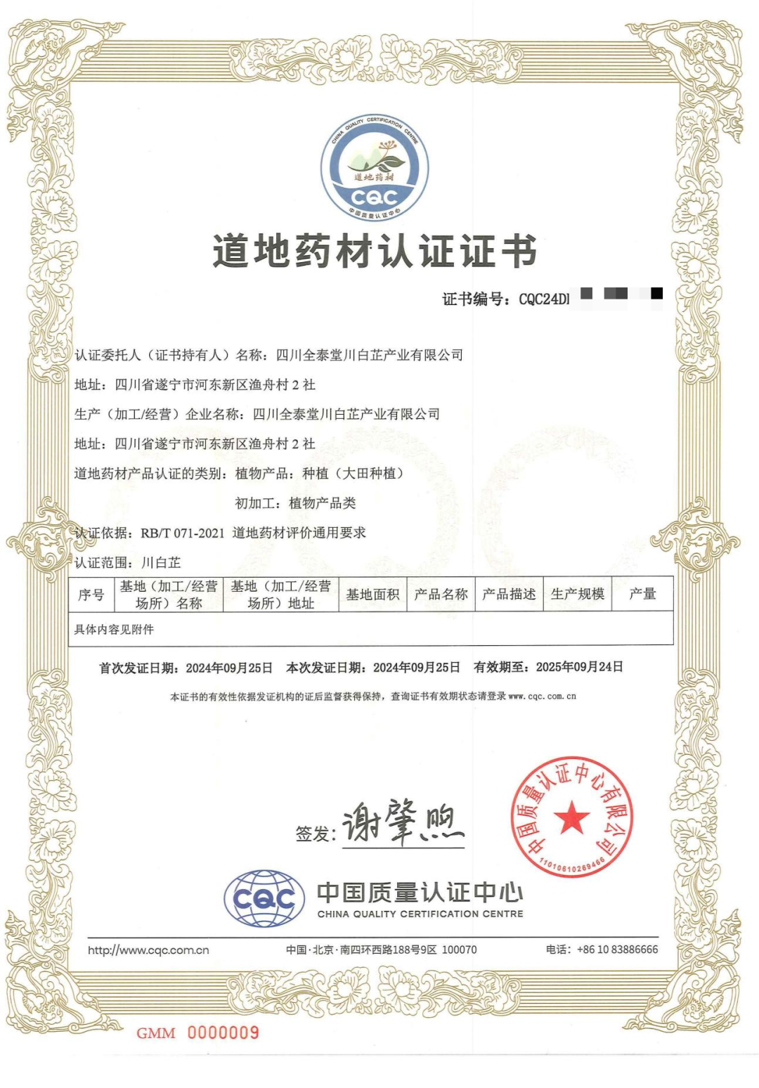 近日,中国检验认证集团四川有限公司正式向四川全泰堂川白芷产业有限公司颁发了四川省第一张道地药材认证证书。此次道地药材认证证书的颁发,是对全泰堂在中药材品质提升方面所取得成果的肯定,也对推动我省川药高质量发展具有积极意义。