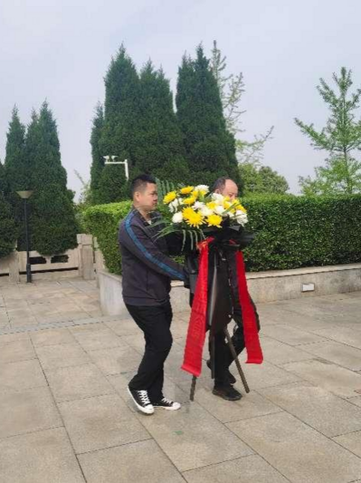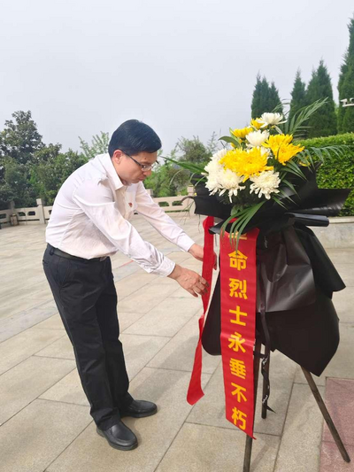 在苍松翠柏掩映的革命烈士纪念碑前,党员代表抬起花篮沿阶而上,将寄托哀思的菊花敬献于碑前;党支部书记邓国军缓步上前,整理花篮挽联;全体人员肃整衣冠,行三鞠躬礼,怀着无限崇敬之情向长眠于此的英烈默哀致敬。